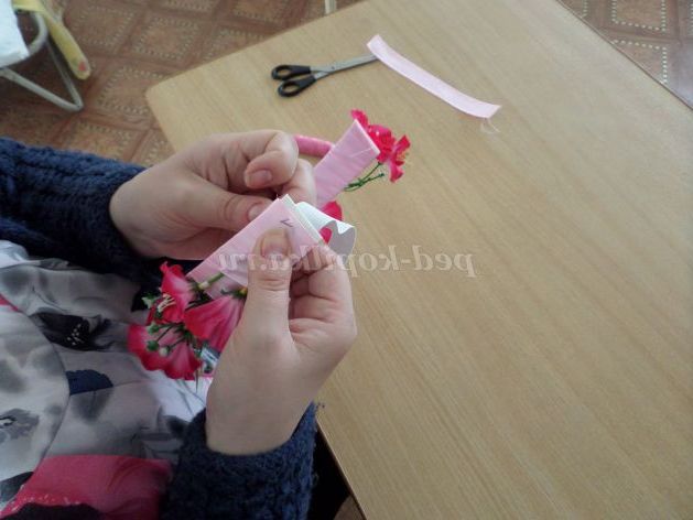 Крок п'ятий:тепер починаємо намотувати стрічку навколо основи, щільно притискаючи квіти.