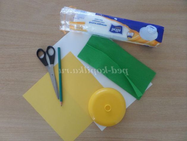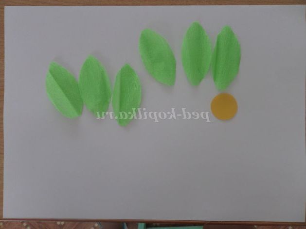 Крок четвертий: з кольорового або гофрованого зеленого паперу вирізаємо листочки в кількості 6 штук і серединку з жовтого паперу.