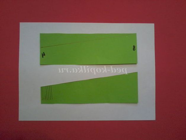 2. З однієї короткої сторони прямокутника відкладаємо 4 см і по лінійці з'єднуємо з кутом протилежного боку. Відрізаємо зайве. Виходить ось така деталь (схема в додатку).