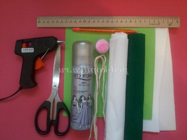 картон для шаблонів, кулькова ручка, ножиці, гарячий пістолет, лак для волосся, косметичний блиск, нитки капронові №20, дріт, гофрований папір біла і зелена.