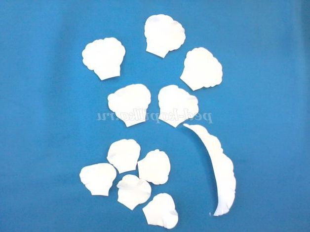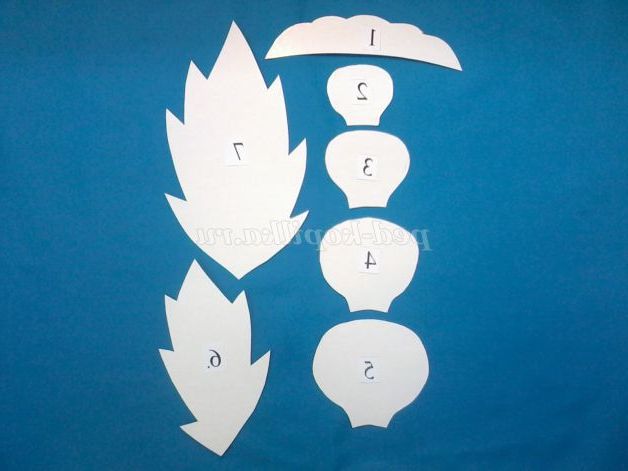 1. З картону вирізати трафарети для пелюсток квітів і листя. Пелюстка складається з верхньої частини і ніжки: шаблон №1 - 1 шт., №2 - 5 шт., №3 - 5шт. (шаблони 4 і 5 для більш великої квітки)