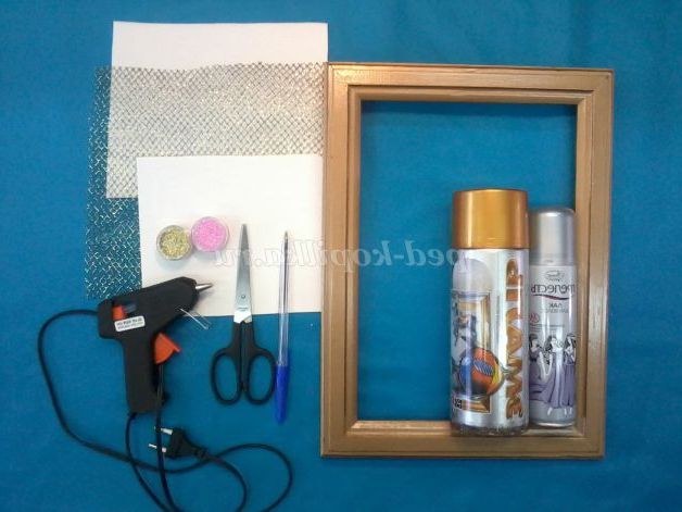 картон для шаблонів, кулькова ручка, ножиці, термопістолет, рамка, сітка пакувальна для фону картини, лак для волосся, косметичний блиск, аерозольна фарба.