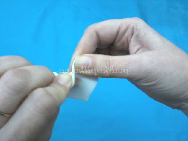 5.Начинаем збірку з середини квітки, для цього намазати нижній край першого пелюстки клеєм і закрутити.