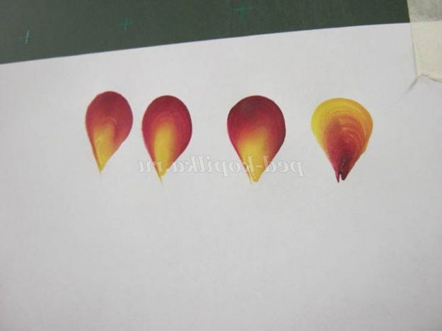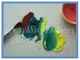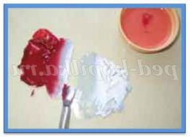 Підготовка до роботи : Розмішуєм на панелі поруч з червоною фарбою білила. Тепер найцікавіше: набираємо фарбу на кисть так, щоб половина щетини забарвлювалася в білий колір, інша половина в червоний.