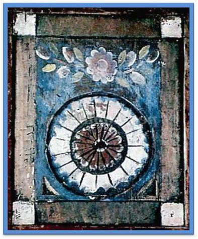 Самий верхній ярус, стелю в будинку - це його "небо". Мотиви, що прикрашали стелю, зв'язувалися з сонцем, світилом, що дарує життя всьому земному, від якого залежала доля селянина. Тому не випадково зображення кола, а пізніше - вінка в домовій розпису. Круги-вінки поміщалися на частинах стелі, що відповідають функціональним зонам. В одному приміщенні їх могло бути кілька. Як і символи світила, кругові малюнки мали значення оберега.