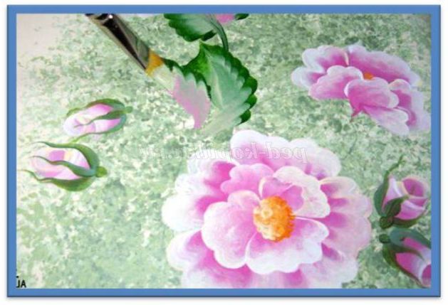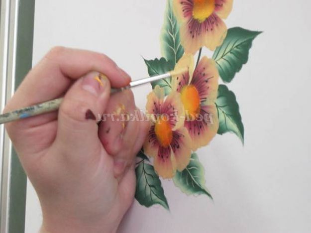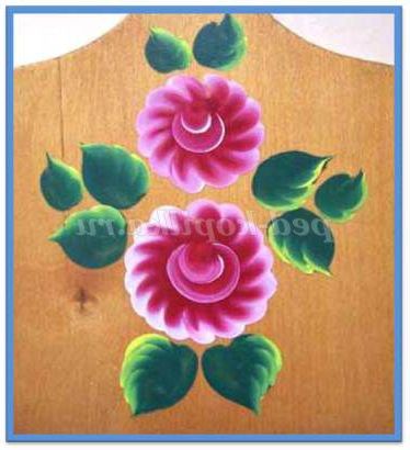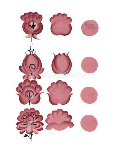 Особливість розпису - двоколірний мазок. На пензлик набираємо два кольори фарби: на одну сторону світлу, на іншу темну фарбу. Для початку спробуємо подвійний мазок на папері, прибираючи надлишки фарби, потім проводиться мазок безперервним рухом, повертаючи кисть в необхідних напрямах. У результаті виходить об'ємний пелюстка квітки або листочка.