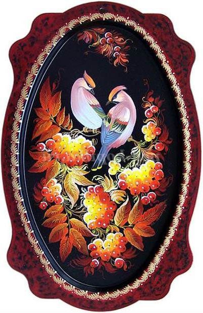 Малюнок на підносі розташовується в центрі. Це квіти, схожі на троянди, тюльпани, лілії, поруч з квітами розташовуються листя, а по краю таці художники малюють траву. Візерунок для своїх підносів майстри знаходять у уральської природи: в лісі, саду, городі, тому на багатьох підносах можна зустріти уральське дерево - горобину.