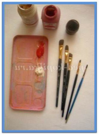 Матеріали урало-сибірської розпису: Старі майстри фарби робили з місцевих мінералів, розтираючи їх, використовуючи оліфу. Але ми будемо використовувати гуаш, плоскі синтетичні кисті №3 -№12. Обов'язково потрібно палітра, на яку необхідно викладати потрібні кольори, ємність для води.