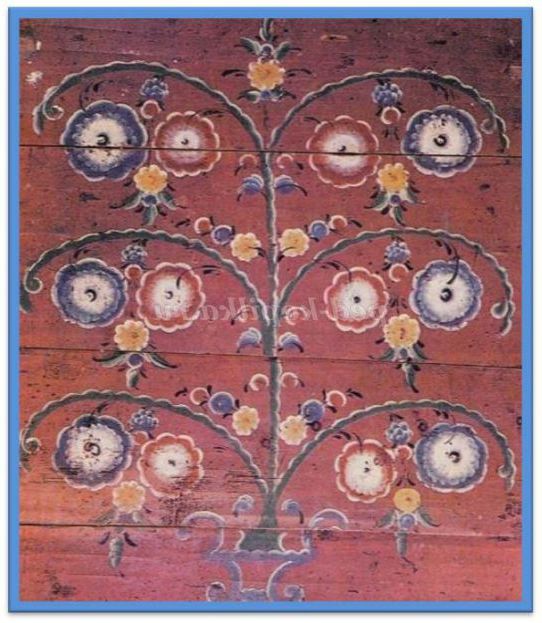 Симетрична композиція, що складається з дерева з парним зображенням птахів, містить побажання благополуччя. І якщо в розписах прялок добропожелательный мотив звернений до жінки, до господині, то домовик розпису - до всієї селянській родині.