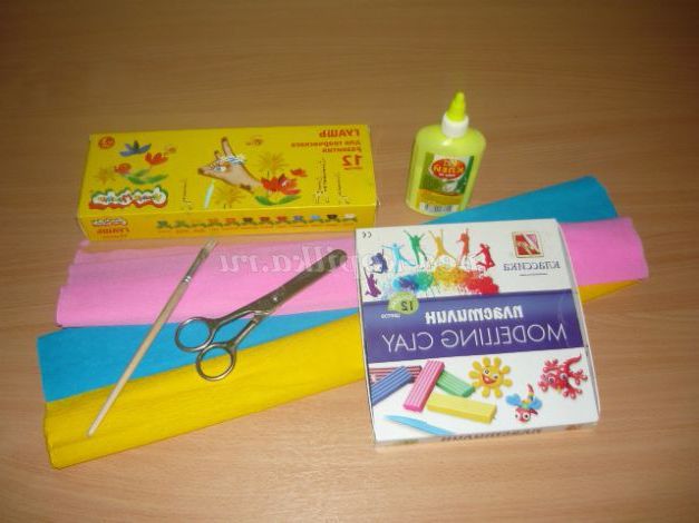 Гофрований папір жовтого, червоного, синього кольору, клей ПВА, пензлик, ножиці, пластилін
