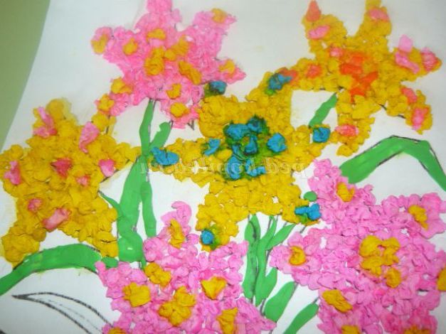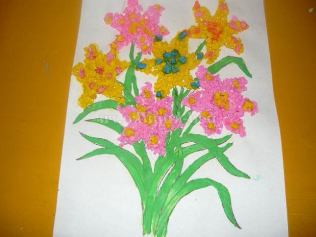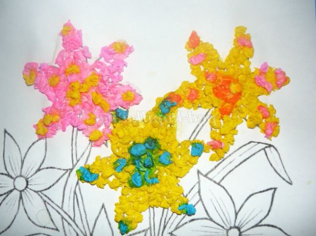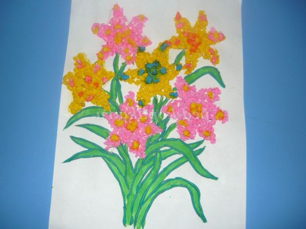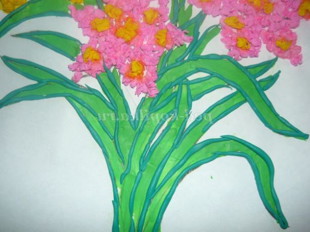 Пластиліном зеленого кольору (світлого відтінку) «зафарбовуємо» листя і стебла квітів - прийом розмазування пластиліну подушечкою пальця.