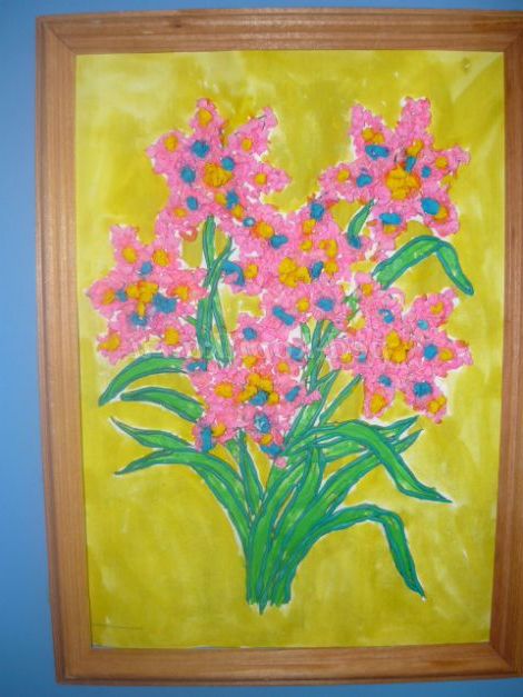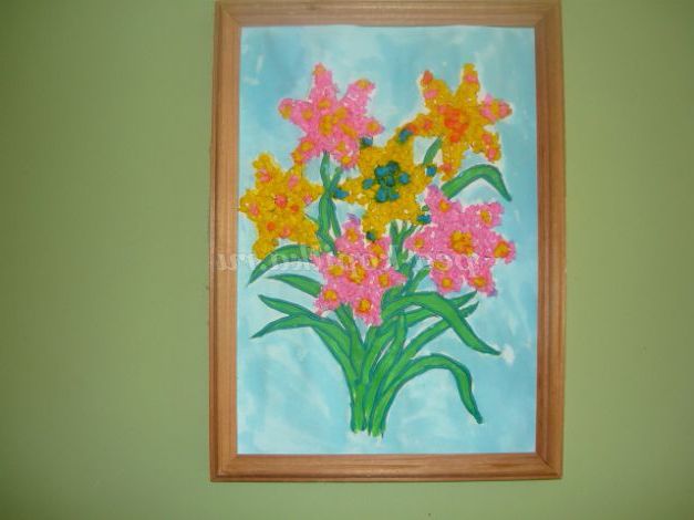 Тонуємо гуашшю фон роботи і вставляємо її в рамку. Робота готова.