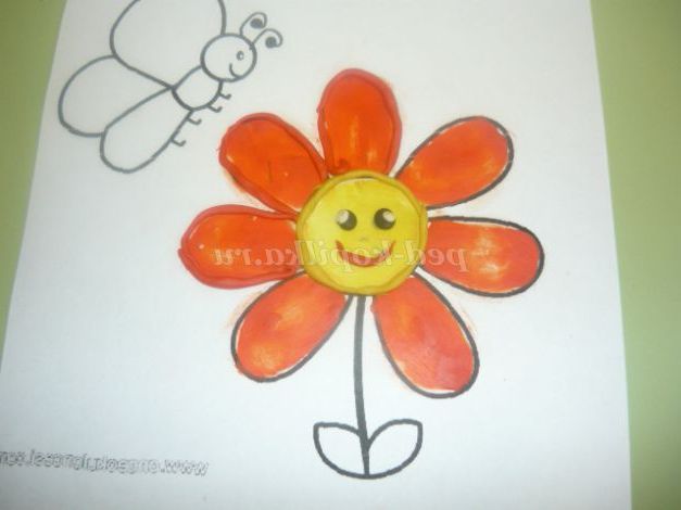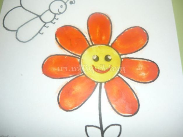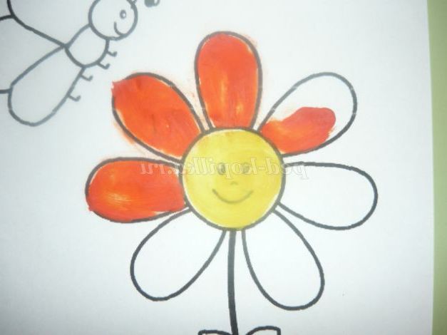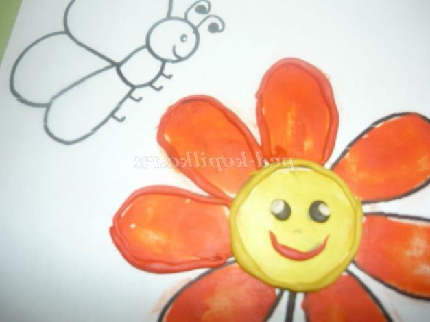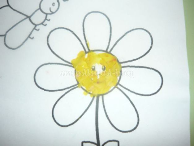 «Розфарбуємо» жовтим пластиліном серединку квітки. Пластилін наносимо маленькими шматочками і рівномірно розмазуємо пальчиками, заповнюючи весь контур.