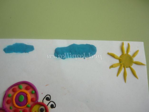 У верхній частині аркуша з'являється сонечко: розплющуємо невеликий кульку між пальчиками, додаємо кілька маленьких ковбасок - «голочок». Блакитним пластиліном робимо кілька мазків довільної форми - хмари.