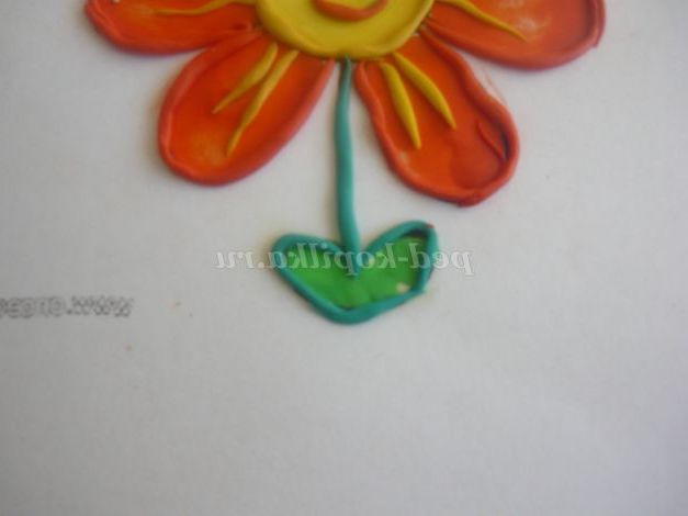 Світлим зеленим пластиліном «зафарбовуємо» листя, темним зеленим обводимо контур і розкачуємо тонку ковбаску - стебло.