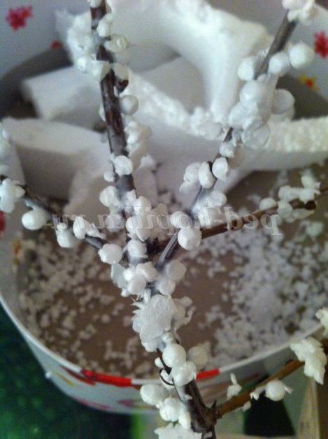 На гілочки обмазані клеєм насипаємо кульки з пінопласту. Стало схоже на гілки, обсипані сніжком.
