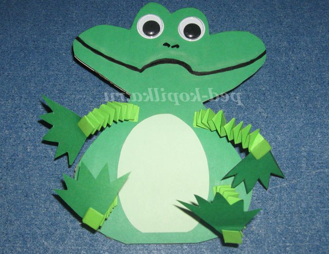 Складаємо папір зеленого кольору малюємо на ній лапку жаби, вирізаємо. Повинно вийти 4 штуки.