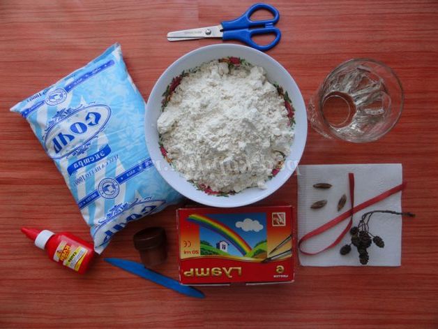 2 склянки борошна, 1 склянка дрібної солі, 250 гр. води. Змішуємо борошно і сіль, додаємо воду і замішуємо тісто. Якщо тісто липне до рук, додайте борошна, якщо кришиться, то трохи води. ( Для міцності можна додати клей ПВА).