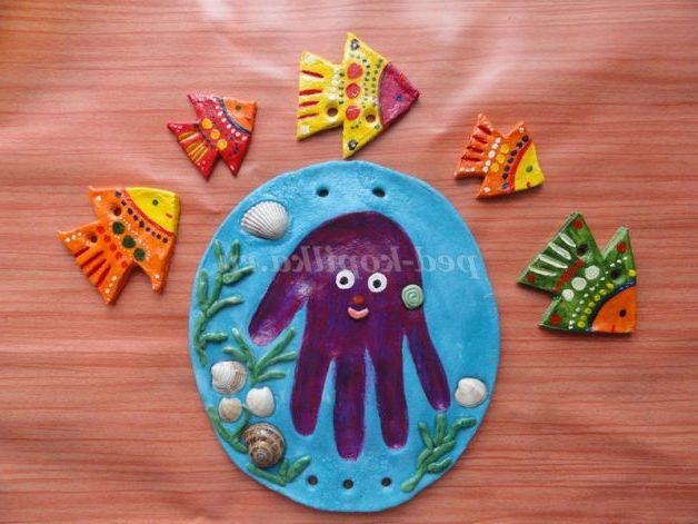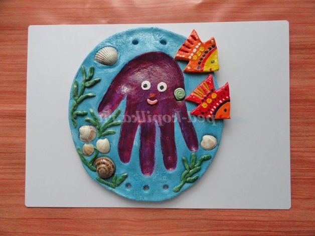 Прикрашаємо нашу підвіску черепашками (вдавлюємо їх в тісто) і робимо водорості з тіста зеленого кольору. Для склеювання використовуйте воду.