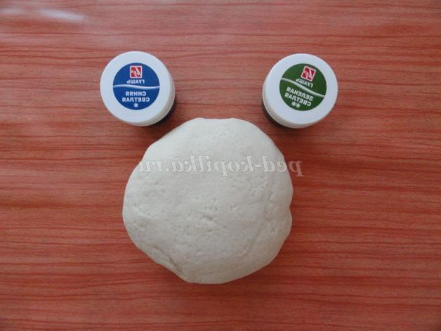 Змішуємо всі складові і вимішуємо тісто. Мені знадобиться безбарвне і тісто блакитного і зеленого кольорів. Для цього потрібно додати гуаш певного кольору і вимісити тісто.