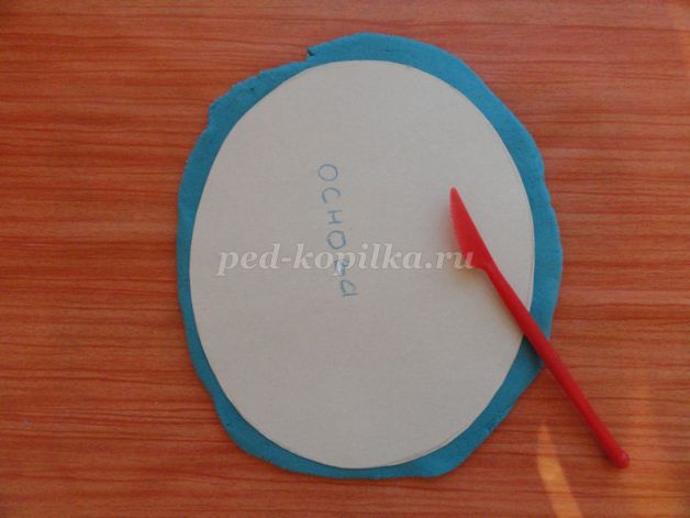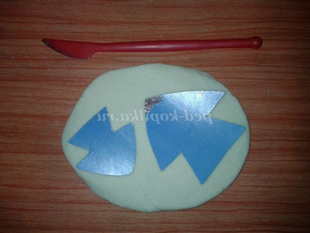 Розкачуємо тісто блакитного кольору, прикладаємо шаблон і вирізаємо стеком основу.