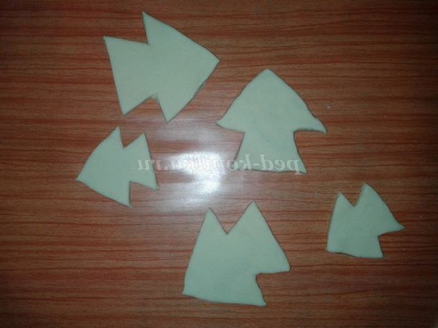 Тепер беремо безбарвне тісто розкачуємо і прикладаємо шаблони рибок. Вирізаємо.