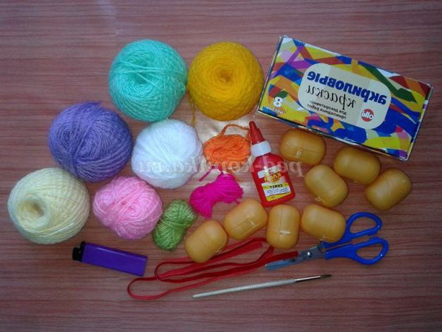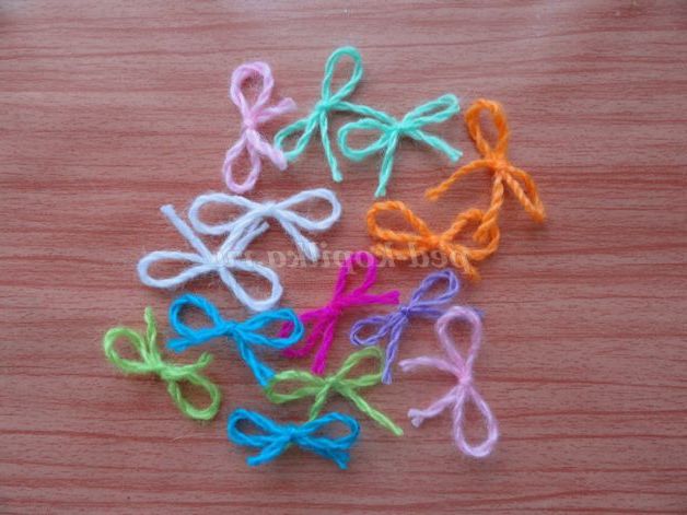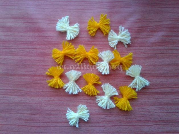 Тепер робимо «чубчики» нашим курчатам. Для цього беремо нитки жовтого і світло жовтого кольорів, намотуємо на два пальці 6-7 оборотів, знімаємо, перев'язуємо. Розрізаємо і підрівнюємо кінчики.