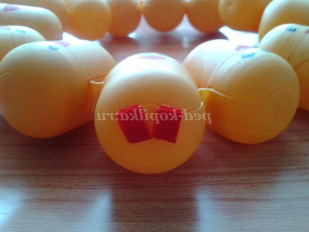 Використовуючи акрилову фарбу червоного кольору, малюємо дзьобики курчатам.