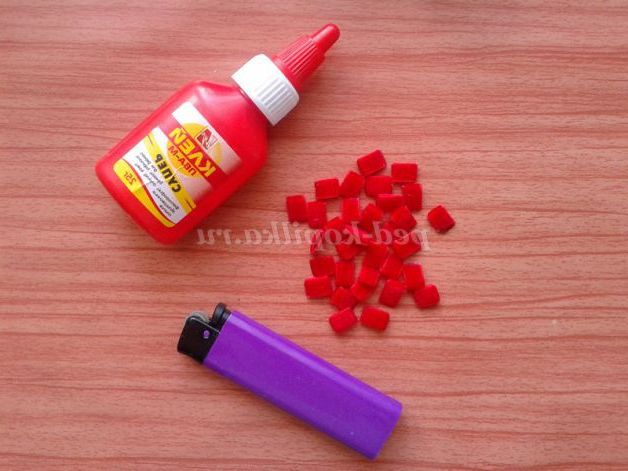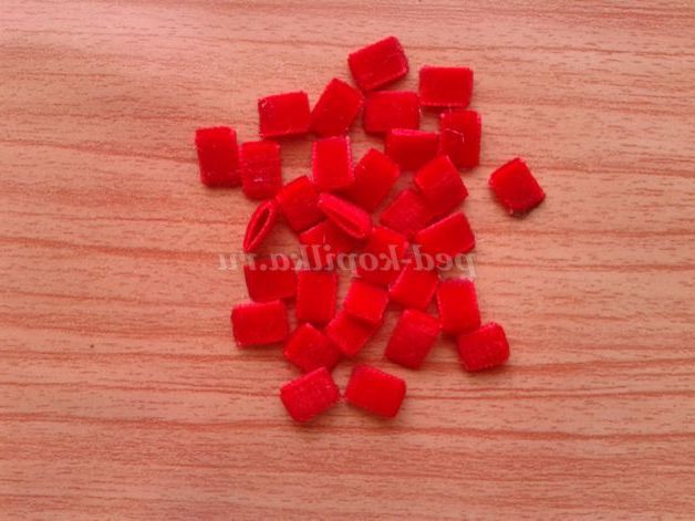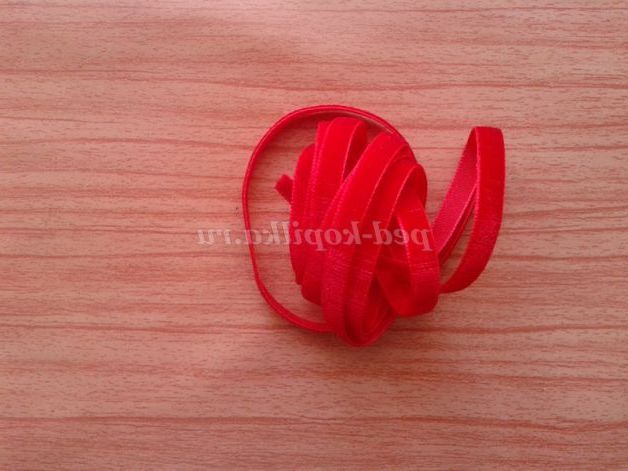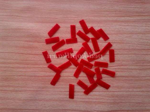 Беремо оксамитову стрічку, нарізаємо на шматочки по 2 см, складаємо навпіл і припаюємо кінці за допомогою запальнички. Можна просто склеїти клеєм ПВА. Виходять ось такі лапки для курчат.