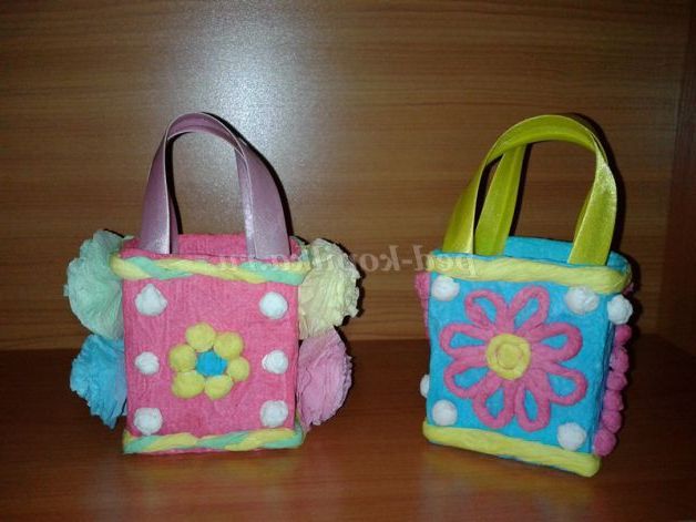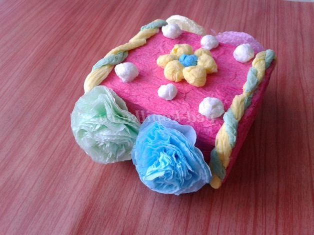 Приступаємо до декорування коробочки. Робимо з серветок різнокольорові кульки, ковбаски, джгутики, кіски та інші різноманітні за формою деталі. Приклеюємо на коробочку.
