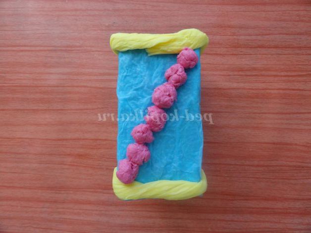 Серветку звертаємо в трубочку, змащуємо руки розчином і робимо джгутик. Приклеюємо на коробочку.