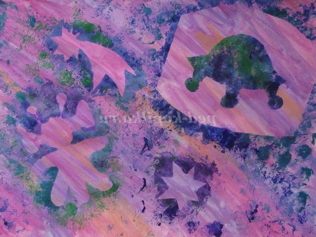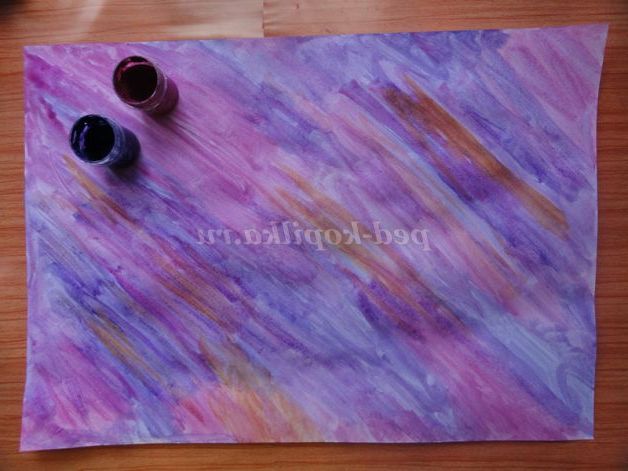 Розвести гуаш на тарілочці або в кришечці. Зім'ятий аркуш паперу або поліетиленовий пакет вмочити в гуаш і такий «печаткою» нанести на поверхню, обмежену трафаретом.