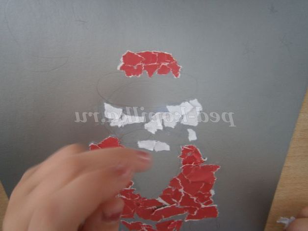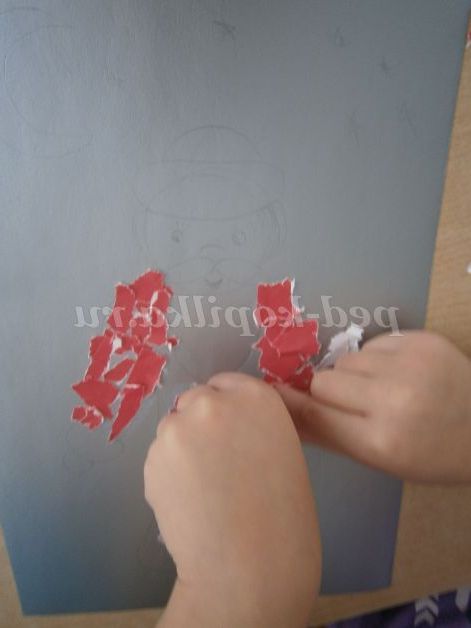 3. Зараз потрібно зробити обличчя Діда Мороза. Для цього рвемо на маленькі шматочки білу папір.