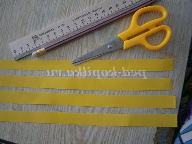 6. Зараз будемо робити рамку. Нам знадобляться олівець, лінійка, ножиці і жовта кольоровий папір. Расчерчиваем на зворотному боці папір, на відстані 1,5 сантиметра.