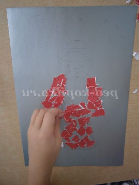 2. Саме перше, що ми зробимо - це шубу Діда Мороза. Для роботи нам знадобитися червона кольорова папір. Її треба розірвати на маленькі шматочки.
