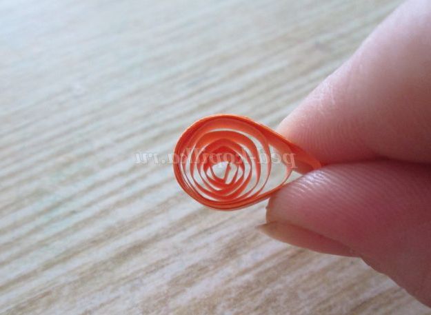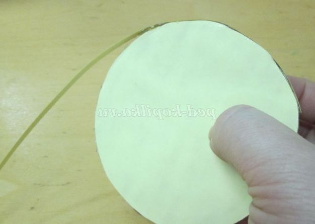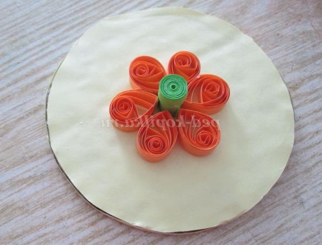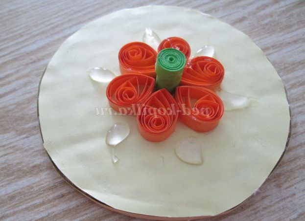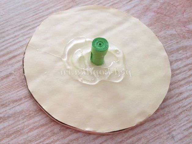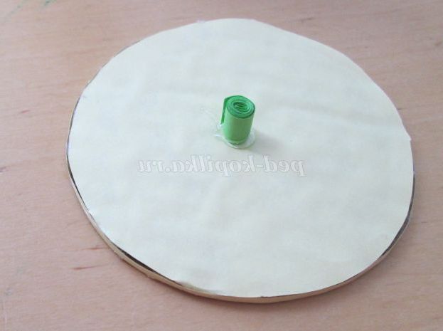 29. Починаємо з серединки, для цього скручуємо тугий рол із смужки шириною 1 сантиметр. Склеюємо рол і приклеюємо на середину кришечки.