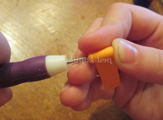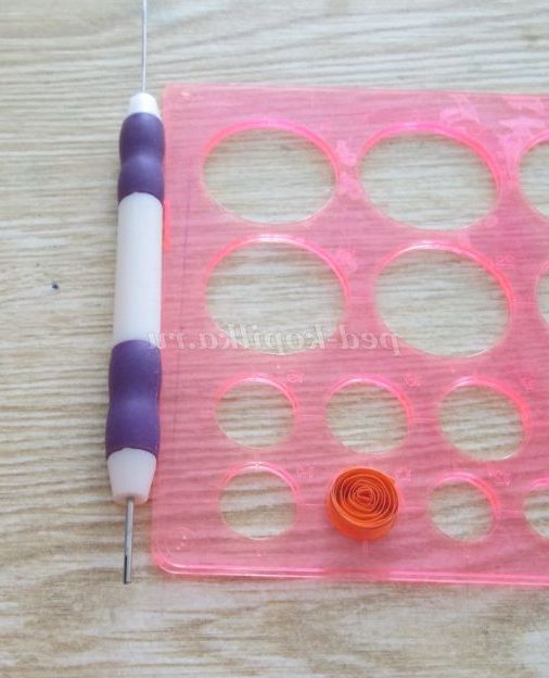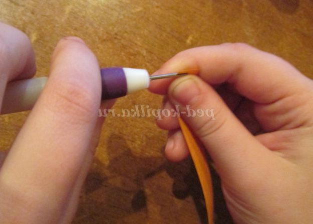 31. Тепер для квіточки, який буде розташовуватися на кришечці, потрібно скрутити 6 ролів помаранчевого кольору. Щоб вони вийшли одного розміру, нам знадобитися лінійка для квілінгу. Почнемо роботу. Скручуємо рол. І кладемо його в лінійку у віконечко №13.