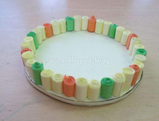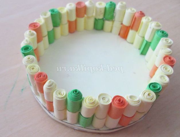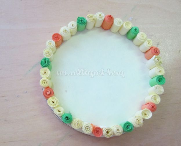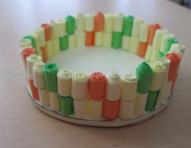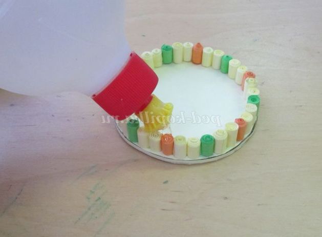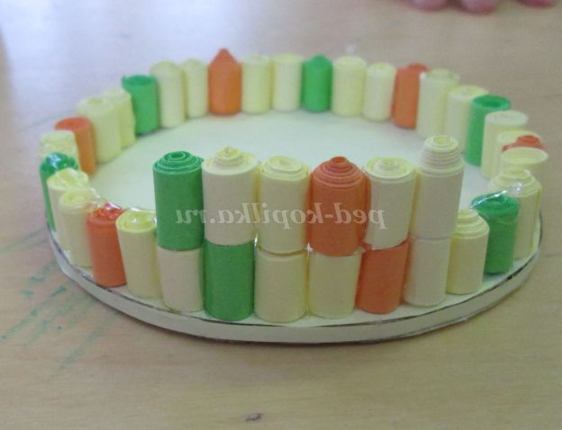 23. Починаємо приклеювати готові роли на дно (справа наліво) в наступній послідовності: два жовтих, один помаранчевий, два жовтих, зелений.