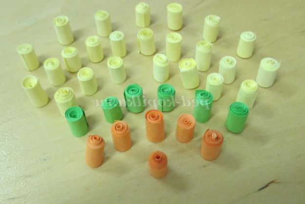 21. Рол готовий. Для одного ряду потрібно 36 ролів: 6 - помаранчевих, 6-зелених, 24 жовтих ролу.