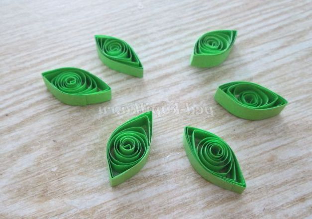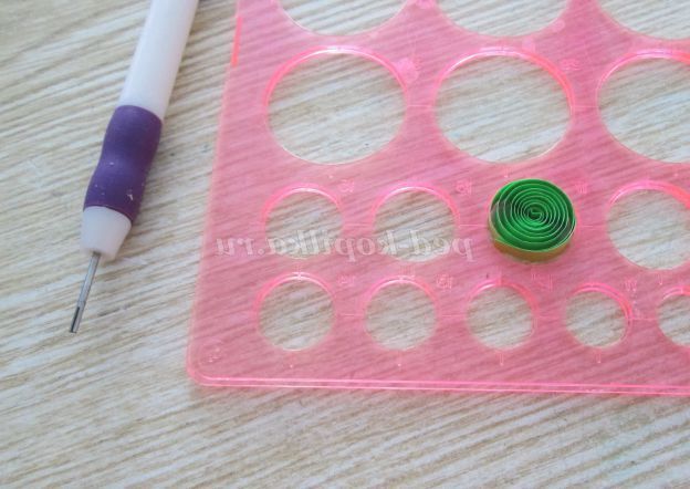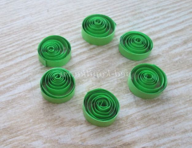39. Продовжуємо роботу з смужками зеленого кольору. Потрібно зробити листочки. Для цього скручуємо 6 ролів. У лінійці користуємося осередком №17.