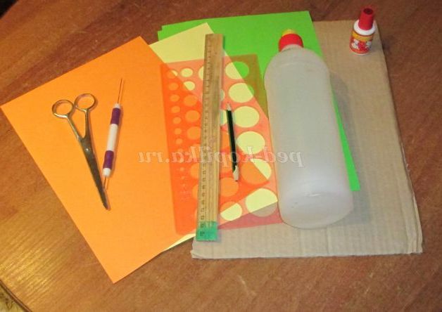Для роботи знадобляться: картон, папір для квілінгу (оранжевого, жовтого і зеленого кольору), інструмент для квілінгу, лінійка для квілінгу, лінійка проста, клей олівець, ножиці, олівець, майстер-клей.