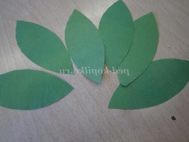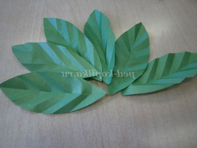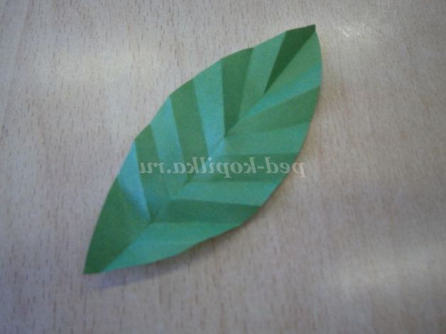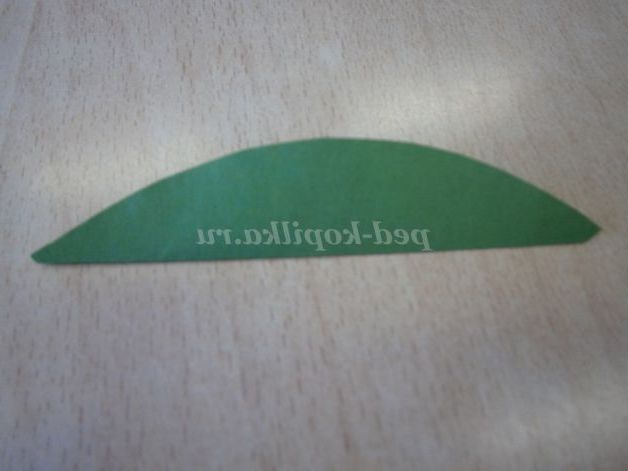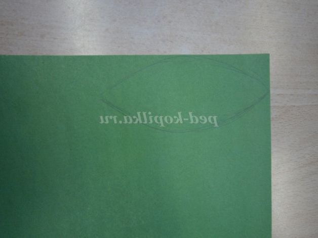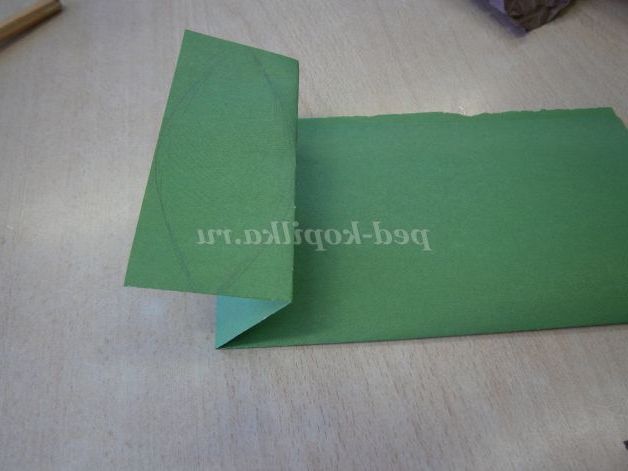 2. Переходимо до виготовлення листочків. Для цього нам знадобитися зелена кольорова папір. Беремо цілий лист, згортаємо його вздовж навпіл. Олівцем малюємо листочок шириною 4 см, довжиною-8 сантіментров.