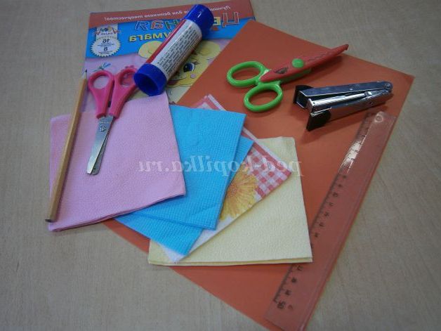 Матеріали: серветки, картон, кольоровий папір, клей, ножиці, прості та фігурні, олівець, степлер.