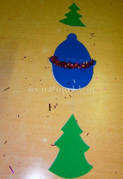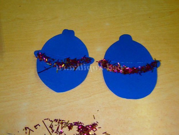 4. Другу гірлянду робимо аналогічно першій. Ялинки у нас готові, зробимо 2 деталі іграшки з синьою оксамитової папери, прикрасимо так само шматочками мішури.