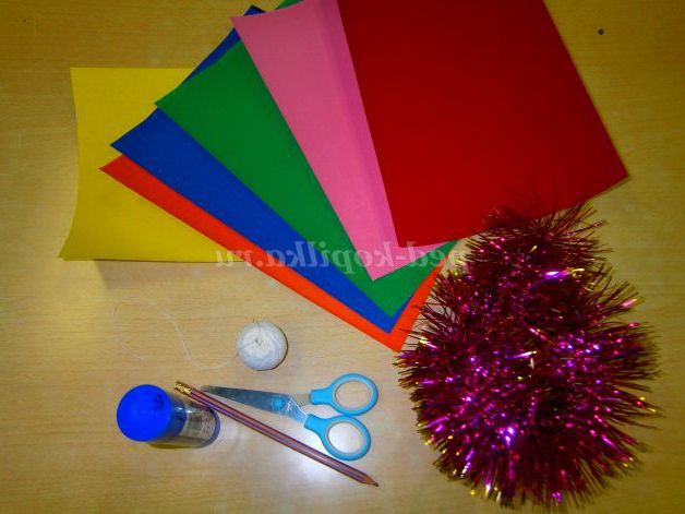 Для роботи знадобляться наступні матеріали: кольоровий оксамитова папір зеленого, рожевого, синього і жовтого кольорів, клей-олівець, ножиці, олівець, ялинкова мішура, клубочок ниток