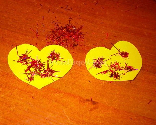 Приступаємо до прикраси частин сердечка. Для цього нам знадобитися мішура. Нарізаємо її на дрібні частинки за допомогою ножиць.