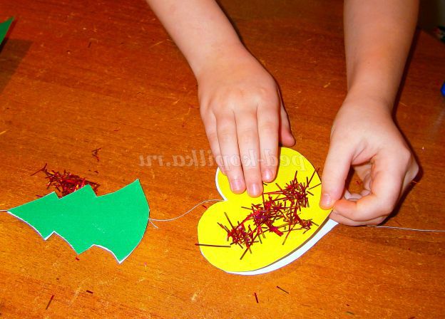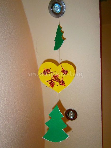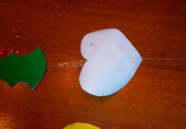 Тепер мажемо клеєм одне сердечко і покладемо його під нитку, трохи відступивши від ялинки.