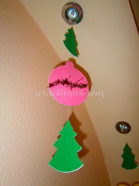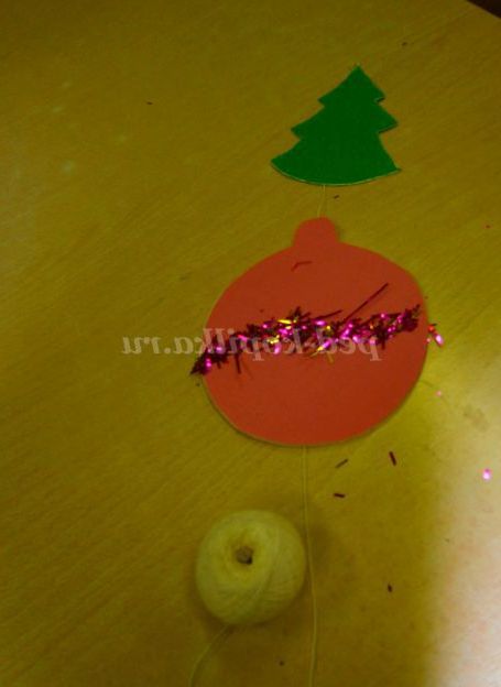 5. Приступаємо до виготовлення третьої гірляндочкі. Вона виконується аналогічно першим двом. Ялинки готові. Ще нам знадобитися оксамитова рожева кольоровий папір. З неї вирізаємо дві сторони кульки. І прикрашаємо дрібними частинками мішури. Збираємо гірлянду точно дотримуючись попередніх інструкцій.