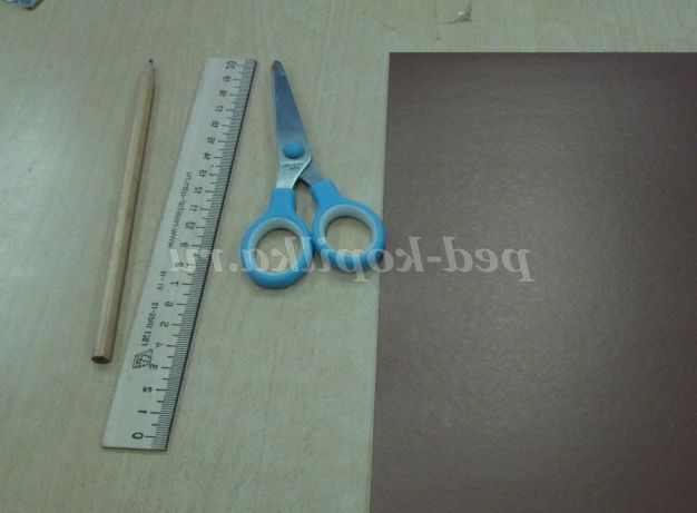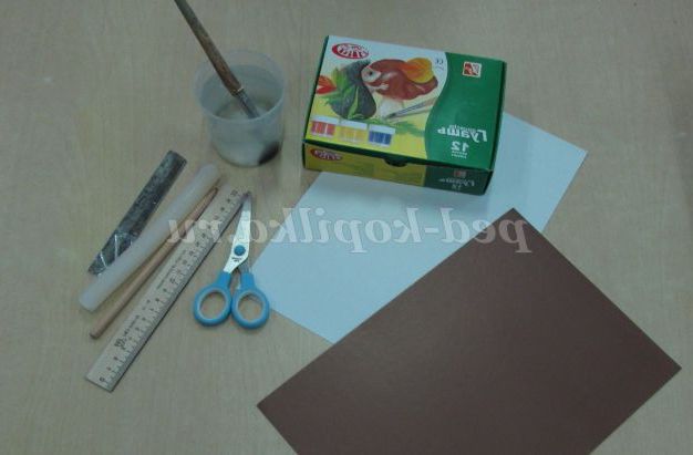 Для роботи знадобляться наступні матеріали: аркуш білого картону, лист коричневого картону, клей - олівець, канцелярський ніж, лінійка, олівець, гуаш, пензлик, склянка з водою