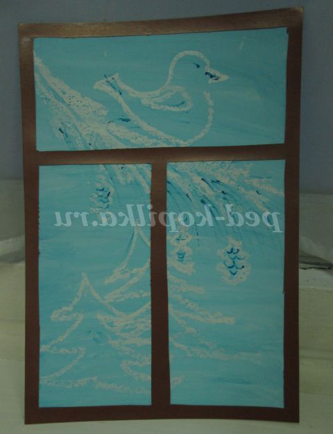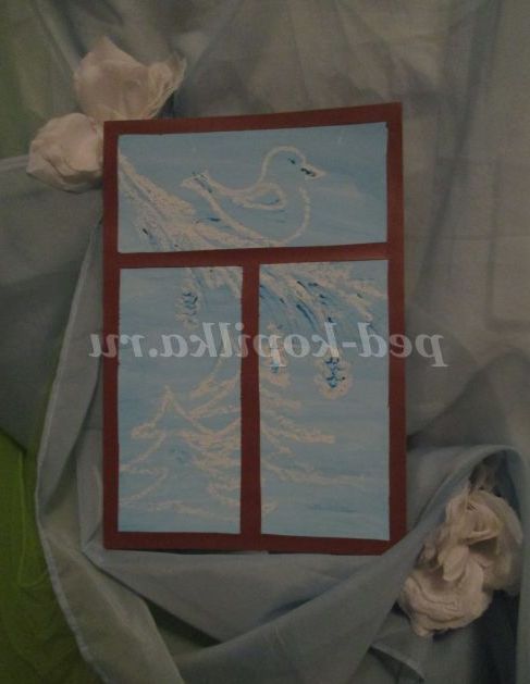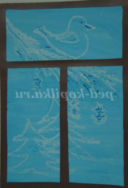 Вихователь: Кожен бачить за вікном щось своє. Ось сьогодні ми з вами будемо малювати зиму. Саме таку, яку ви хотіли б бачити за вікном або ту, яку ви бачили за вікном. Так і буде називатися робота: «За моїм вікном зима». Але наша робота буде таїти в собі крапельку чарівництва.